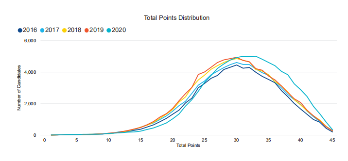 從歷年成績分布看,28分屬于一般水平,34分以上屬于優(yōu)秀,38分以上屬于很優(yōu)秀,40分以上屬于非常優(yōu)秀,而44或45分屬于頂尖優(yōu)異。