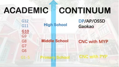 我們學校是為孩子提供連續穩定縱向打通的課程的。您從這張PPT上可以直觀地看到,我們的1-5年級就是IB的小學項目,紅色部分是IB的中學項目,藍色則進入高中項目。我們從一開始的頂層設計,就希望為學生提供連續穩定的K12課程體系。