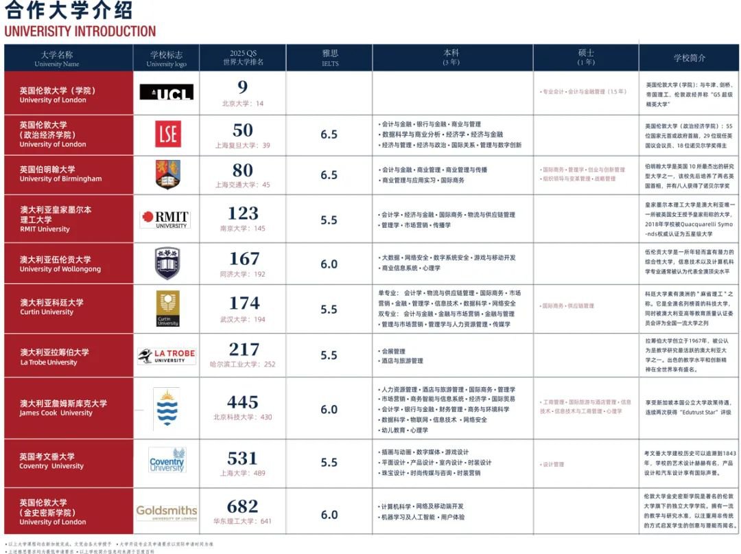 學(xué)校以“中西融合+多元升學(xué)”為特色,學(xué)生在林國(guó)榮完成三年學(xué)習(xí)后,可直升世界百?gòu)?qiáng)高校本科(新加坡分校),如: