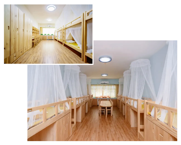 AB樓宿舍區(qū):為凹型結(jié)構(gòu)學生公寓,分A樓和B樓,共5層,每層17個房間,每間可安排4-5位學生住宿,宿舍配有公共學習室、活動室、洗衣房、盥洗室和廁所。