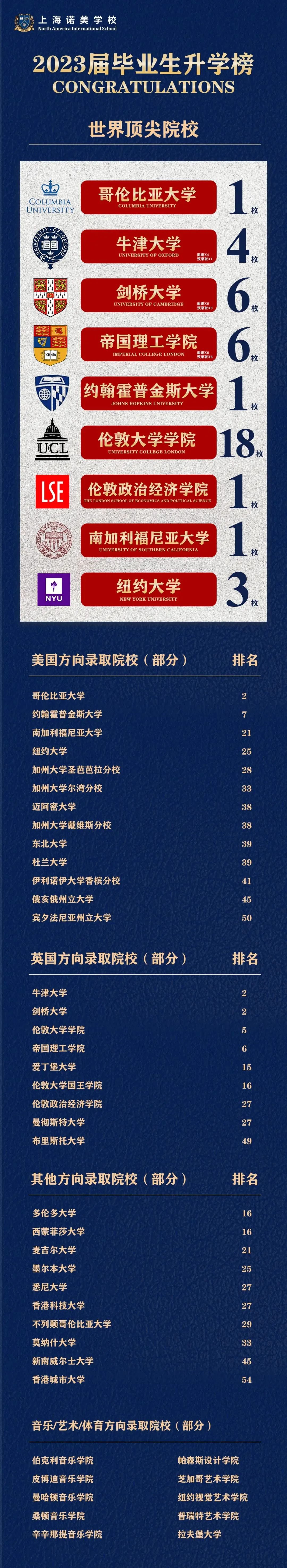 2023屆畢業(yè)生作為諾美學(xué)校第四屆畢業(yè)生,他們在升學(xué)錄取中取得新的突破,收獲了哥倫比亞大學(xué)、約翰霍普金斯大學(xué)、南加利福尼亞大學(xué)、紐約大學(xué)等世界頂尖大學(xué)的Offer,并實(shí)現(xiàn)了牛劍G5大滿貫。其中,75%學(xué)生獲得了全球/全美Top30院校錄取,93%學(xué)生獲得全球/全美Top50院校錄取,100%學(xué)生獲得全球/全美Top100大學(xué)。