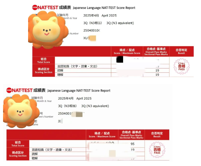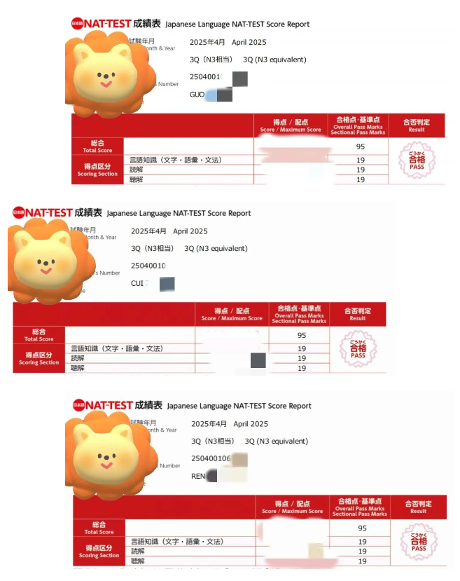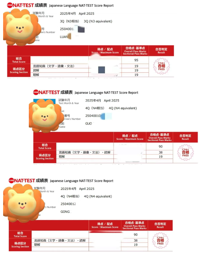 近日,2025年4月日本語NAT-TEST考試成績已經揭曉。在國開中學國際部日語組優秀教師團隊的帶領下,同學們考級全員合格,通過率100%!從日語零基礎到N3、N4的飛躍不僅是對同學們刻苦學習的肯定,也是老師們辛勤付出的最佳回報!以下是部分同學的喜報分享,趕緊來吸口歐氣吧~